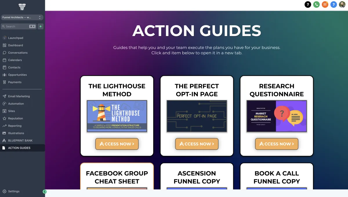 You'll have quick, convenient access to the entire collection of Action Guides from inside the Funnel Architects App. Just select the guide you want to see and click to open it in another tab.