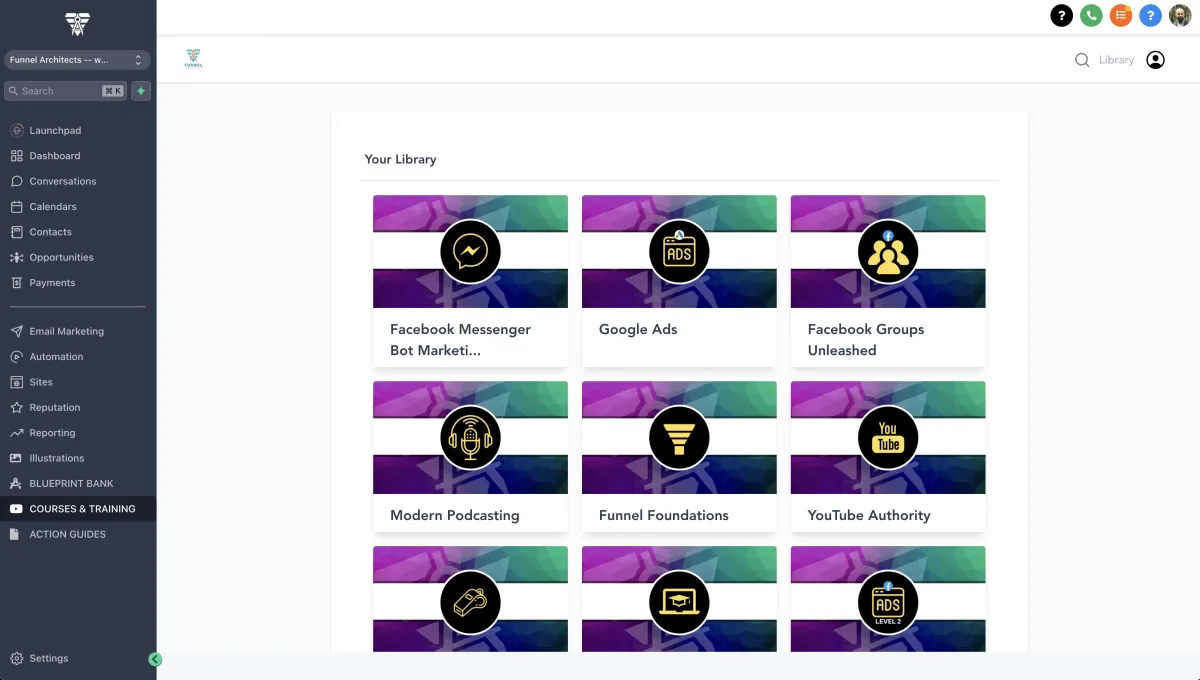 You'll have quick, convenient access to the entire collection of courses and training from inside the Funnel Architects App. Just select the course or workshop you want to see and click to open it right inside the app.